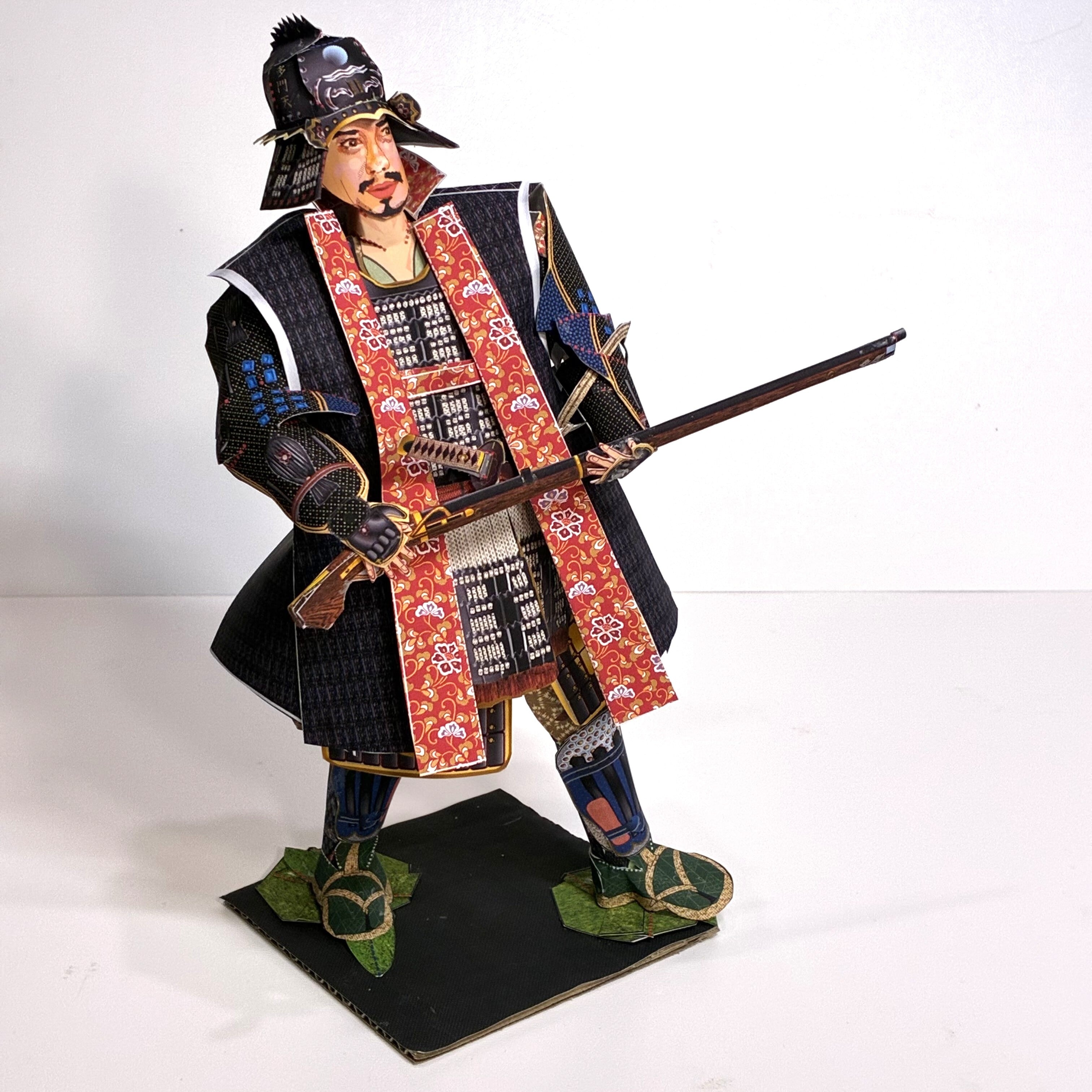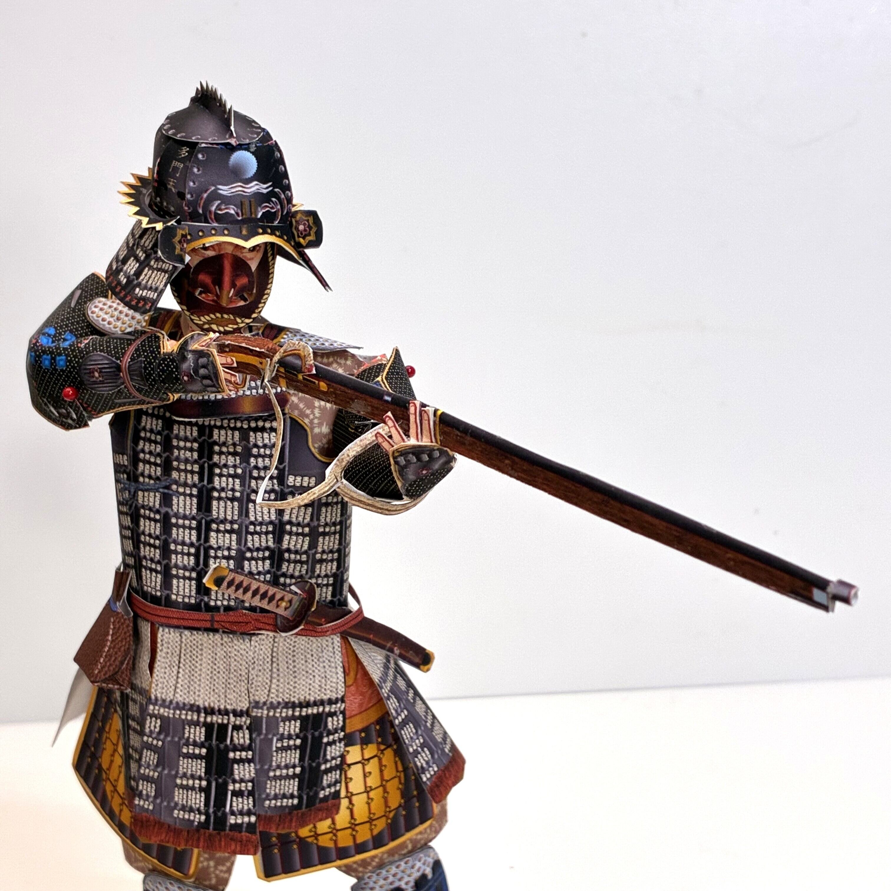 *織田信長に抵抗した本願寺に味方し、鉄砲で名を上げた紀州の土豪「雑賀孫一」。現存する雑賀党の兜「雑賀鉢」を着用した甲冑姿をモデル化しました。雑賀鉢の仕様に合わせた甲冑「啄木糸威二枚胴具足」も同時に再現。珍しい火縄銃仕様で「雑賀孫一」が鉄砲を放つ勇姿を再現できます。